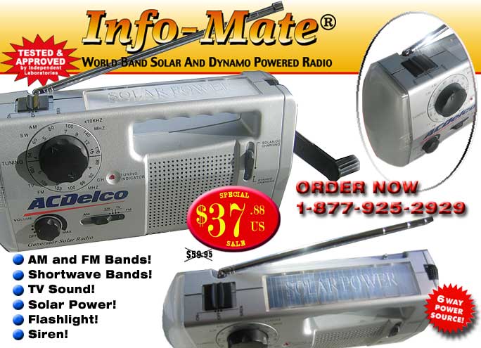Sunmate Infomate Multiband AM, FM, SW Radio powered by Dynamo or Solar energy. Click here. |
